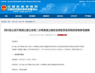 【綿陽正信公司·招標(biāo)部消息】受四川省公安廳高速公路公安局二分局委托由我公司招標(biāo)代理部代理的“四川省公安廳高速公路公安局二分局高速公路安全預(yù)警系統(tǒng)采購項(xiàng)目”于2020年11月6日在中國政府采購網(wǎng)掛網(wǎng)競爭性磋商,請潛在供應(yīng)商應(yīng)在綿陽市涪城區(qū)安昌路17號(hào)富臨大廈4-15號(hào)獲取采購文件,并于2020年11月19日 14點(diǎn)00分(北京時(shí)間)前提交響應(yīng)文件。