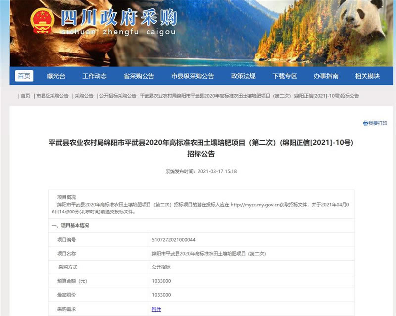 【綿陽正信·招標(biāo)部消息】我公司受平武縣農(nóng)業(yè)農(nóng)村局委托,對平武縣農(nóng)業(yè)農(nóng)村局綿陽市平武縣2020年高標(biāo)準(zhǔn)農(nóng)田土壤培肥項目(第二次)擬采用公開招標(biāo)方式進行采購,本項目于2021年03月17日在四川省政府采購網(wǎng)公示,預(yù)計于2021年04月06日14:00在綿陽市安昌路17號富臨花園四樓15號開標(biāo)。