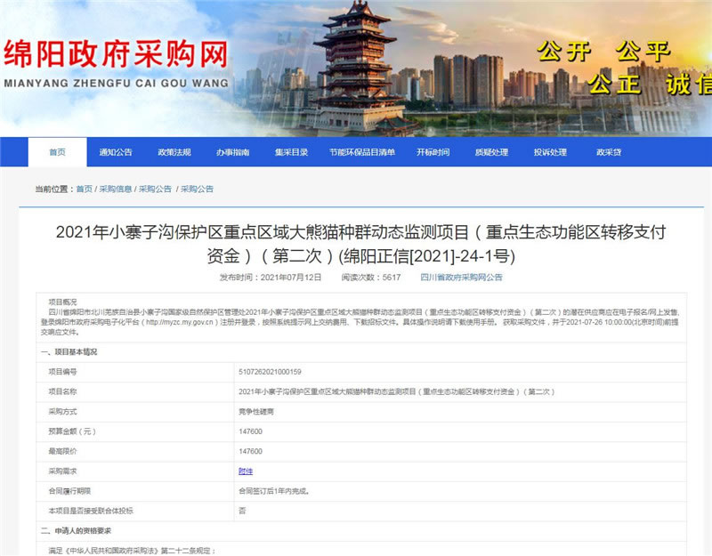 【綿陽正信·招標(biāo)部消息】我公司受四川省綿陽市北川羌族自治縣小寨子溝國家級自然保護區(qū)管理處委托,對2021年小寨子溝保護區(qū)重點區(qū)域大熊貓種群動態(tài)監(jiān)測項目(重點生態(tài)功能區(qū)轉(zhuǎn)移支付資金)(第二次)擬采用競爭性磋商方式進行采購,本項目于2021年07月12日在四川省政府采購網(wǎng)和綿陽市政府采購網(wǎng)掛網(wǎng)公示,預(yù)計于2021年07月26日10:00在綿陽市安昌路17號富臨花園四樓15號開標(biāo)。