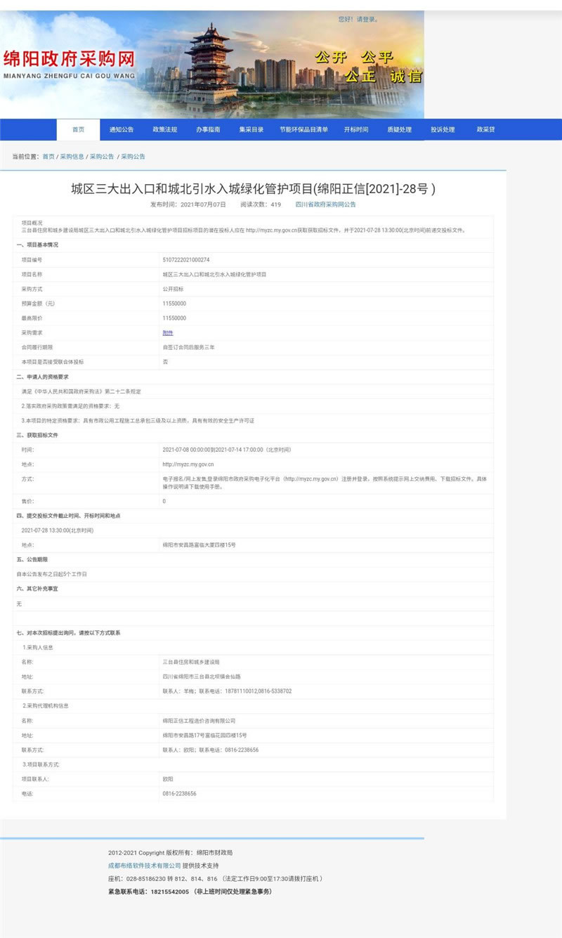 【綿陽正信·招標部消息】我公司受三臺縣住房和城鄉(xiāng)建設(shè)局委托,城區(qū)三大出入口和城北引水入城綠化管護項目擬采用公開招標方式進行采購,本項目于2021年07月07日在四川省政府采購網(wǎng)公示,預計于2021年07月28日13:30在綿陽市安昌路17號富臨花園四樓15號開標。