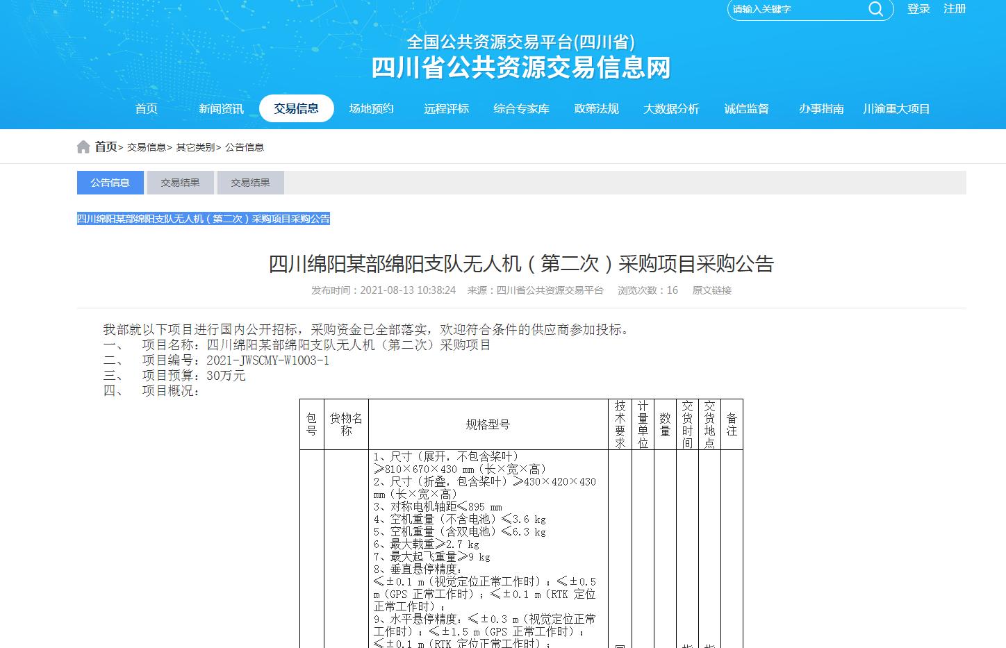 【綿陽正信·招標(biāo)部消息】我公司受四川綿陽某部綿陽支隊委托,對四川綿陽某部綿陽支隊無人機(第二次)采購項目擬采用公開招標(biāo)方式進行采購,本項目于2021年08月13日在《全國公共資源交易平臺(四川省)》公示,于2021年09月6日13:30在綿陽市涪城區(qū)三江西路北段1號桃花島商業(yè)街第4幢商業(yè)樓(詳見一樓電子顯示屏)開標(biāo)。