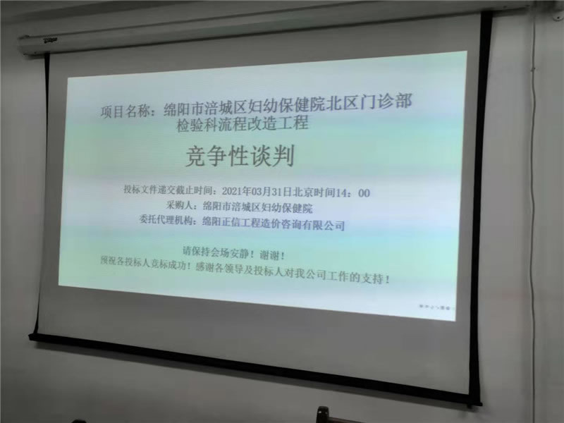 【綿陽(yáng)正信·網(wǎng)絡(luò)消息】2021年3月31日,綿陽(yáng)正信造價(jià)咨詢有限公司政府采購(gòu)部進(jìn)行了“綿陽(yáng)市涪城區(qū)婦幼保健院北區(qū)門(mén)診部檢驗(yàn)科流程改造工程”項(xiàng)目的開(kāi)標(biāo)活動(dòng)。此次開(kāi)標(biāo)項(xiàng)目的采購(gòu)人:綿陽(yáng)市涪城區(qū)婦幼保健院,采購(gòu)方式:競(jìng)爭(zhēng)性談判。